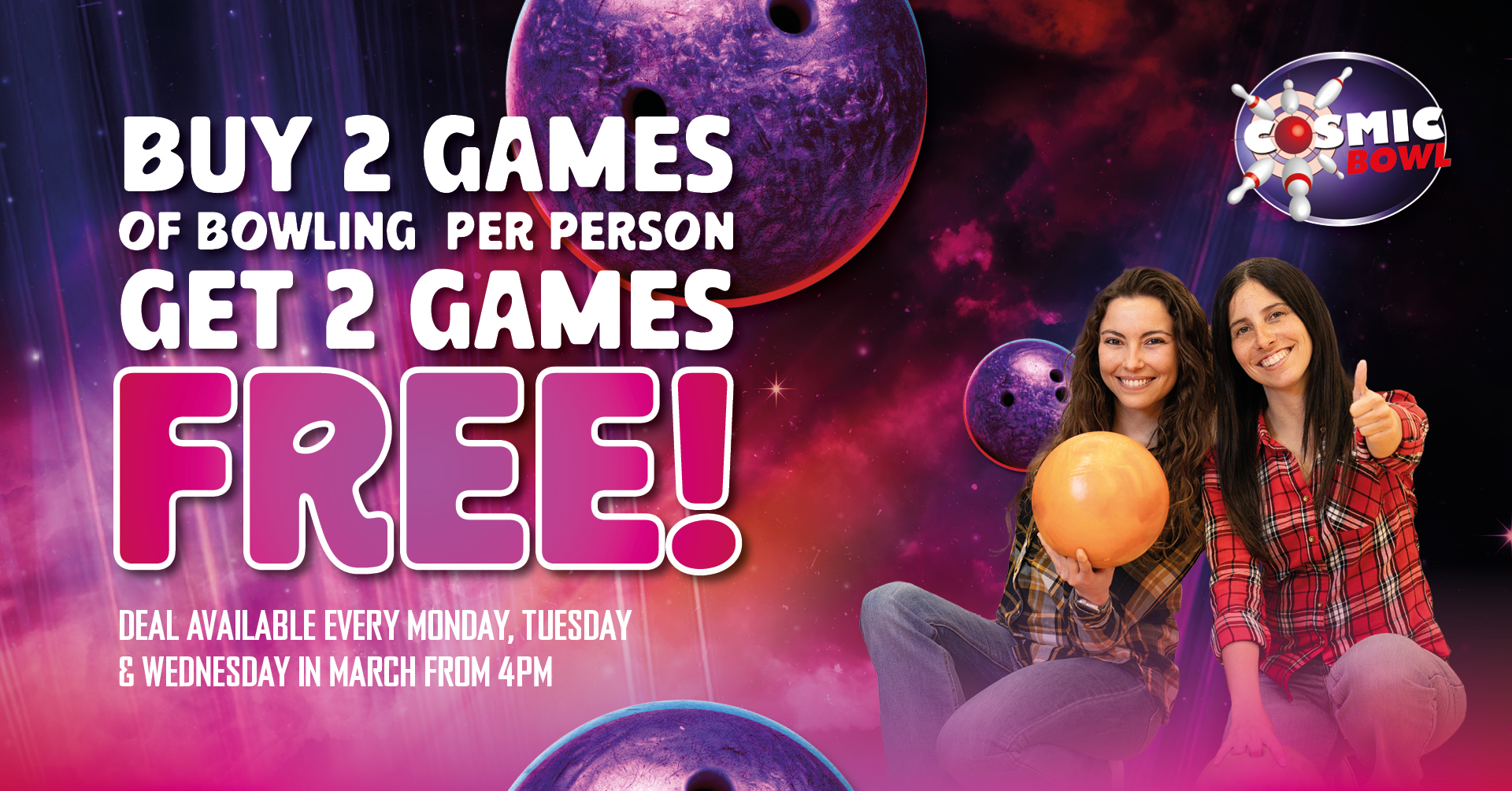 march Cosmic Bowl 2 Games Free Deal FB Web Image – February 2026 Where we are Enter your postcode below for directions to Cosmic Bowl. Postcode Go
